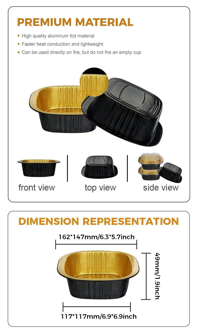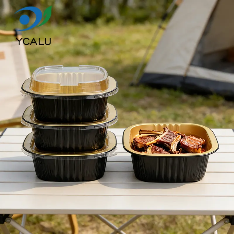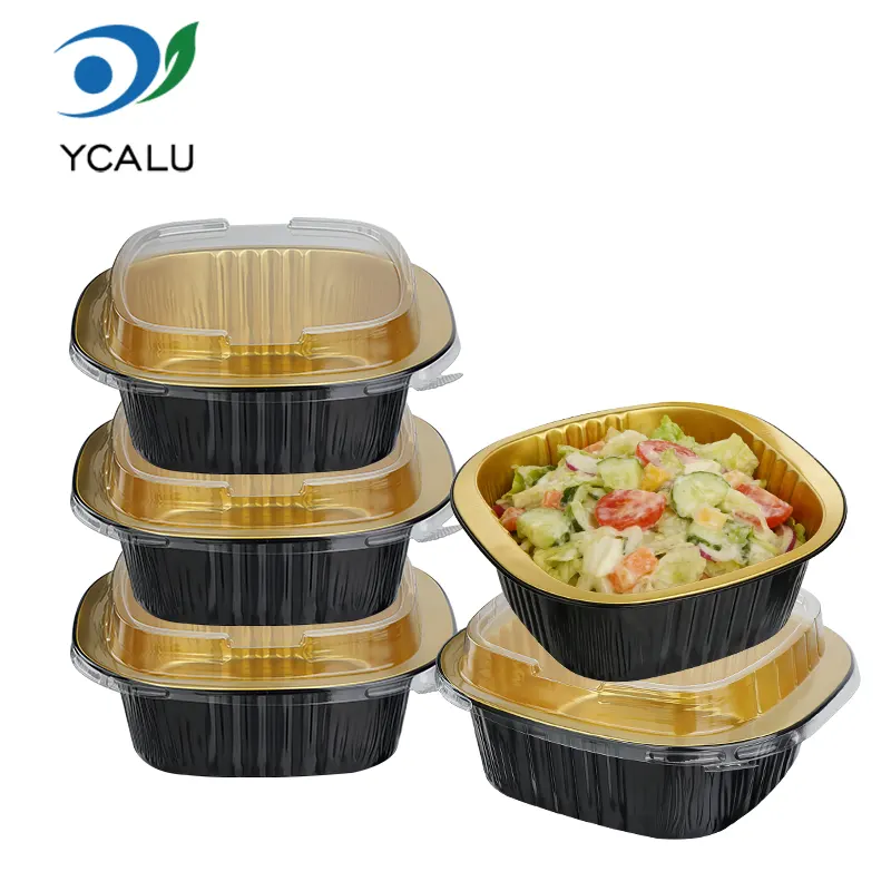 Jednorázový dvouuchý čtvercový box dodavatele z hliníkové fólie Yunchu s černou zlatou stěnou z hliníkové fólie má čtvercový tvar, plné využití prostoru, zaoblené a hladké rohy, žádné ostré otřepy a bezpečnější použití; promyšlený design s dvojitým uchem, ergonomický, izolovaný a proti opaření, snadno se bere, i když obsahuje teplá jídla a polévky, lze jej snadno držet, abyste se vyhnuli popálení rukou a vyřešili nepohodlné bolestivé místo tradičních hliníkových krabic. Vyrobeno ze zesílené hliníkové fólie, má pevnou a houževnatou texturu, silnou nosnou kapacitu a snadno se nedeformuje nebo nepoškodí. Pojme jídlo s polévkami a tuky bez protečení nebo problémů s bočním prosakováním a jeho trvanlivost je daleko vyšší než u běžných jednorázových obědových boxů.