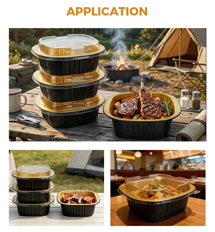 • Jednorázové binaurální čtvercové krabice černé zlaté hliníkové fólieJednorázové binaurální čtvercové krabice černé zlaté hliníkové fólie