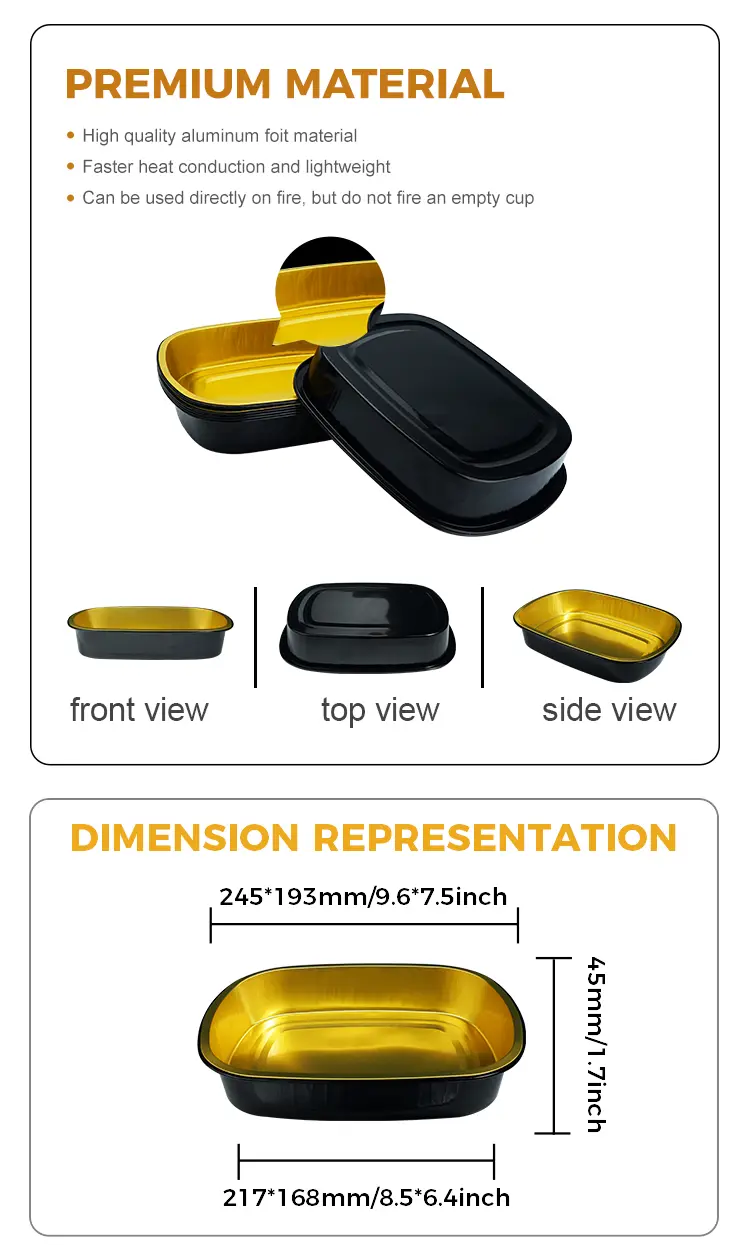 Yunchu aluminum foil supplier Disposable black gold baking tray Rectangular Aluminum Foil Containers MF1450 is suitable for large-scale catering, especially suitable for canteen catering, restaurant chain stores and refrigerated food distribution and other scenarios, this product is made of high-strength aluminum foil material, low height is suitable for some turkey, grilled fish, stewed and other ingredients of food to place, Silná tepelná vodivost může rovnoměrně rozptýlit vysokou teplotu, aby se zajistilo, že jídlo je rovnoměrně zahříváno, s dobrou kapacitou nesoucí zátěž a tlakovým výkonem, aby se zajistilo, že není snadné vytáhnout a deformovat během přepravy, lze použít s tepelným těsněním nebo plastovým víkem.