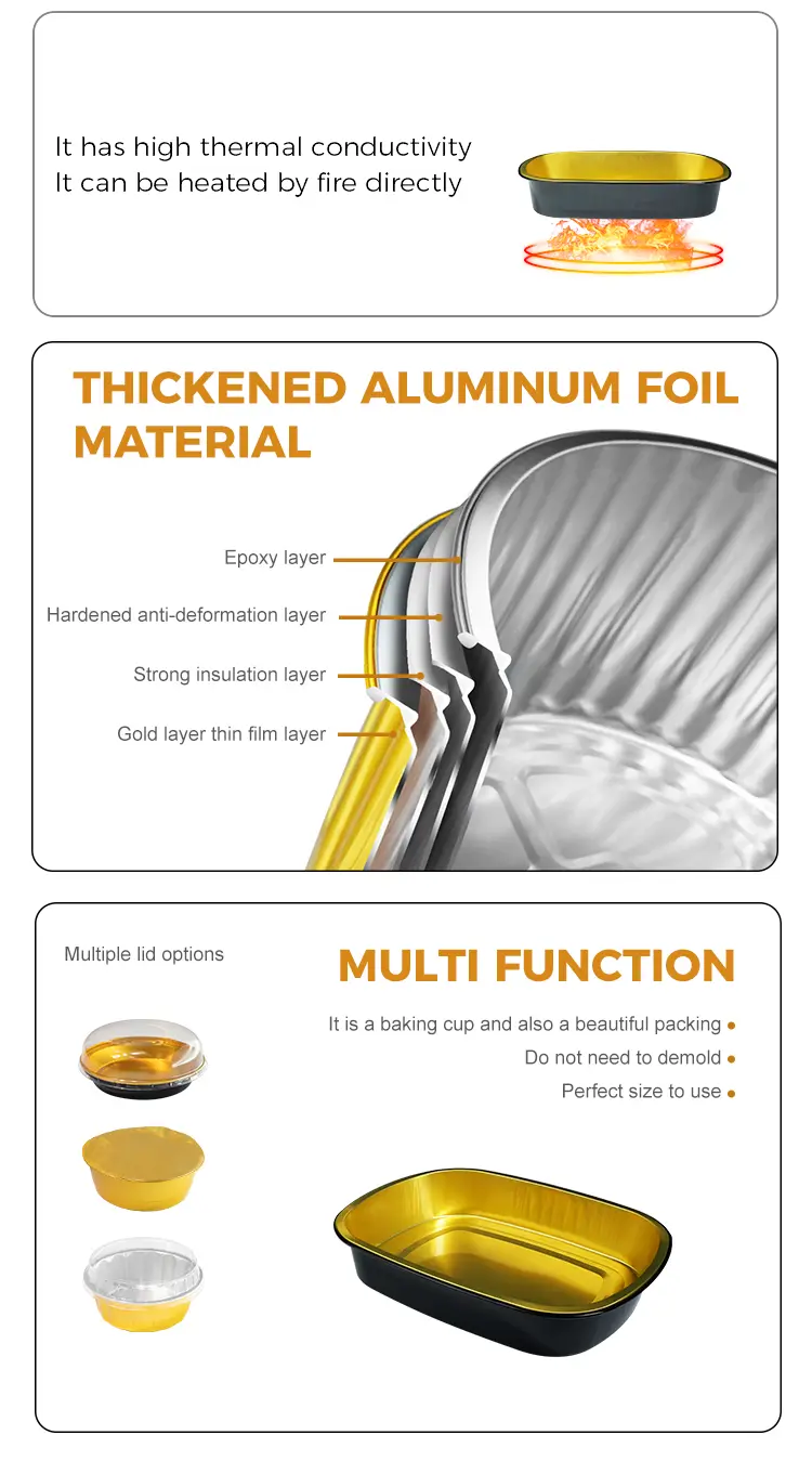 ​Yunchu aluminum foil supplier Disposable black gold baking tray Rectangular Aluminum Foil Containers MF1450 is suitable for large-scale catering, especially suitable for canteen catering, restaurant chain stores and refrigerated food distribution and other scenarios, this product is made of high-strength aluminum foil material, low height is suitable for some turkey, grilled fish, stewed and other ingredients of food to place, Silná tepelná vodivost může rovnoměrně rozptýlit vysokou teplotu, aby se zajistilo, že jídlo je rovnoměrně zahříváno, s dobrou kapacitou nesoucí zátěž a tlakovým výkonem, aby se zajistilo, že není snadné vytáhnout a deformovat během přepravy, lze použít s tepelným těsněním nebo plastovým víkem.