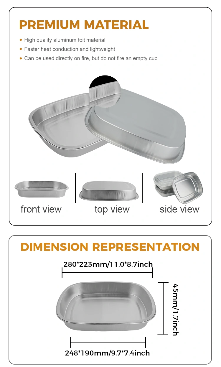 4. Čtvercové pánve z hliníkové fólie s sebou mají jednoduché a elegantní linie doplněné moderním stříbrným leskem. Může zvýšit vizuální přitažlivost jídla a celkovou kvalitu, což pomáhá posílit profesionální a luxusní image značky.