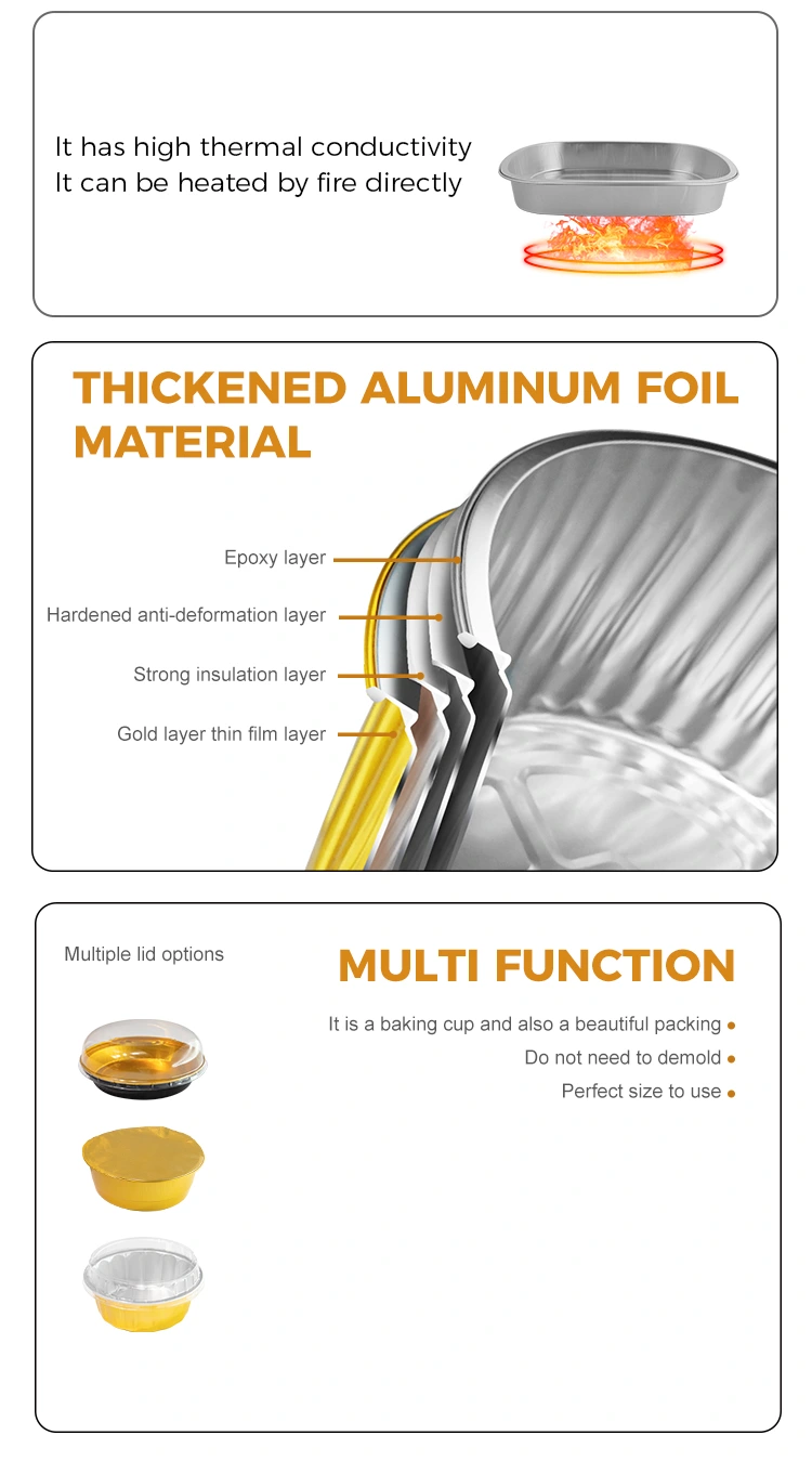 Je to perfektní obal na vaječné koláče, brownies, cupcaky, jednotlivé plátky pizzy nebo listové pečivo. Izolační vlastnost hliníkové fólie pomáhá udržovat teplo a měkkou texturu pečiva ihned po upečení; perfektně si zachovává chuť a hodí se k vytažení z pekáren a kaváren.