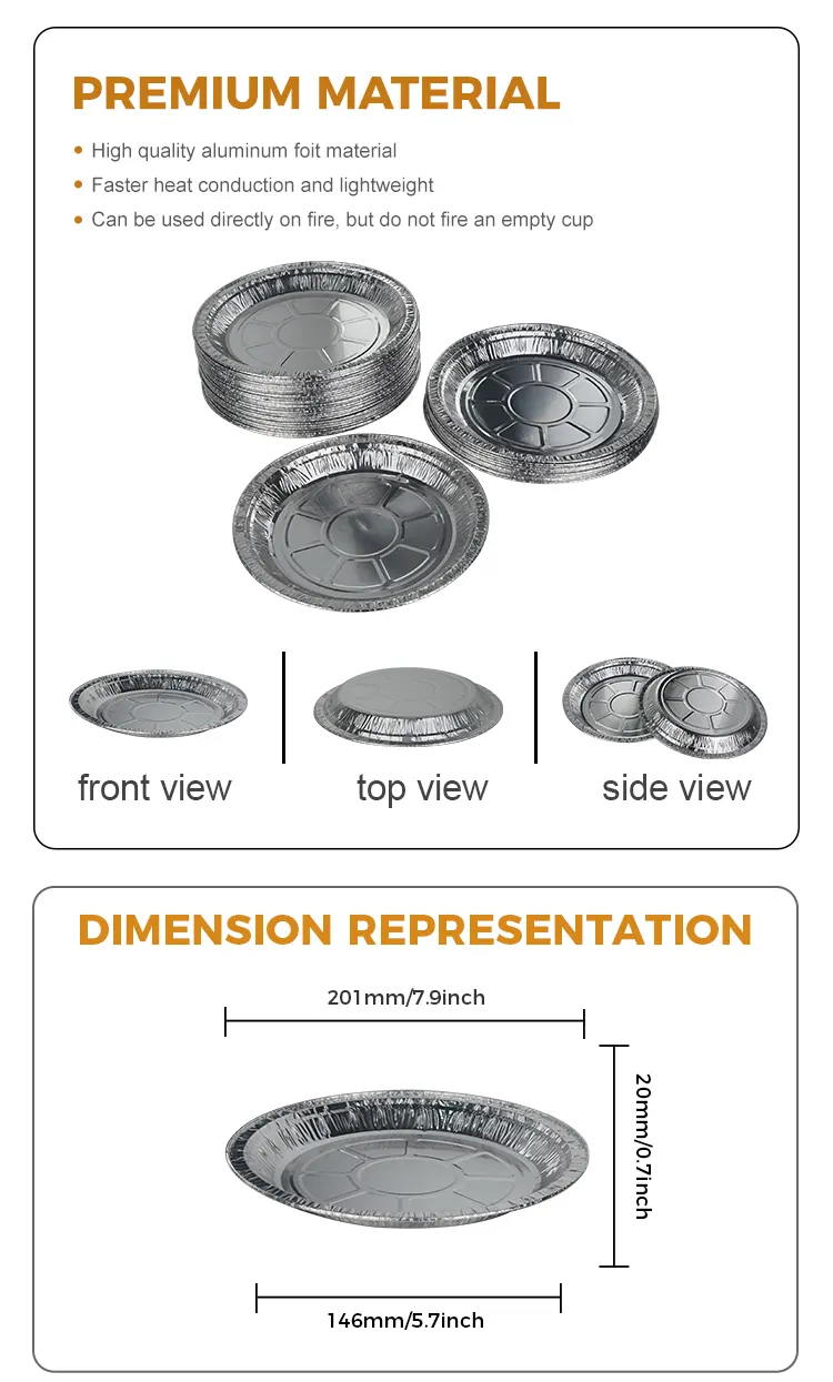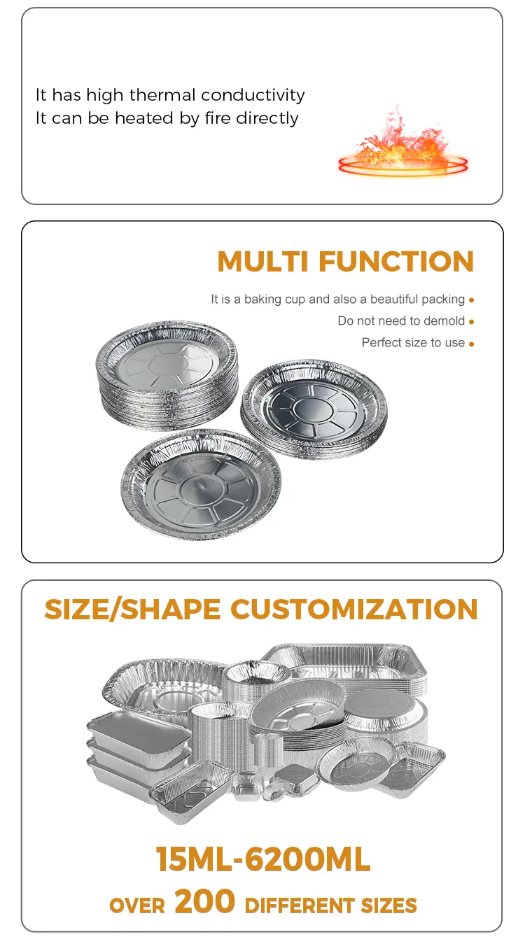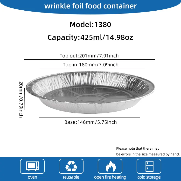 Jednorázová disková fritéza Yunchu s hliníkovou fólií Stříbrná hliníková fóliová nádoba je hygienická a šetrná k životnímu prostředí. Je vyrobena ze zesílených a korozi odolných materiálů, které se snadno nedeformují a mohou být v přímém kontaktu s potravinami. Nebojí se vysokých teplot, není spálený, nespálený a není snadné ho vysypat. Odolá vysokým teplotám až do 250 °C a je vhodný pro různé způsoby vaření, jako je vysokoteplotní pečení, trouba, grilování, takže se není třeba obávat. K dispozici je několik specifikací pro splnění různorodých potřeb pečení různých velikostí, což vám umožní snadno se vyrovnat s různými požadavky na výrobu potravin.