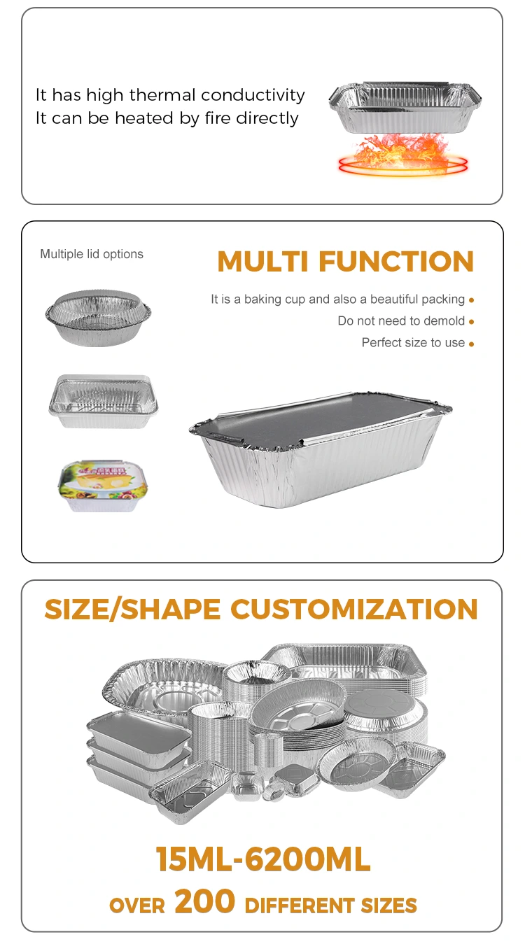 Tato jednorázová krabička s rychlým občerstvením grilování stříbrných hliníkových fólií je vyrobena z vysoce kvalitního materiálu hliníkové fólie 8011, který má dobrý účinek na ochranu tepla a může udržovat teplotu potravy, což způsobuje, že jídlo je chutnější a chutnější. Kromě toho je naše obdélníkový BBQ stříbrná hliníková fóliová nádoba také vybavena tepelnou izolační funkcí, která může být spárována s víkem hliníkové fólie nebo plastovým víkem PET, což je vhodné pro přizpůsobené logo a dále zvyšuje image značky.