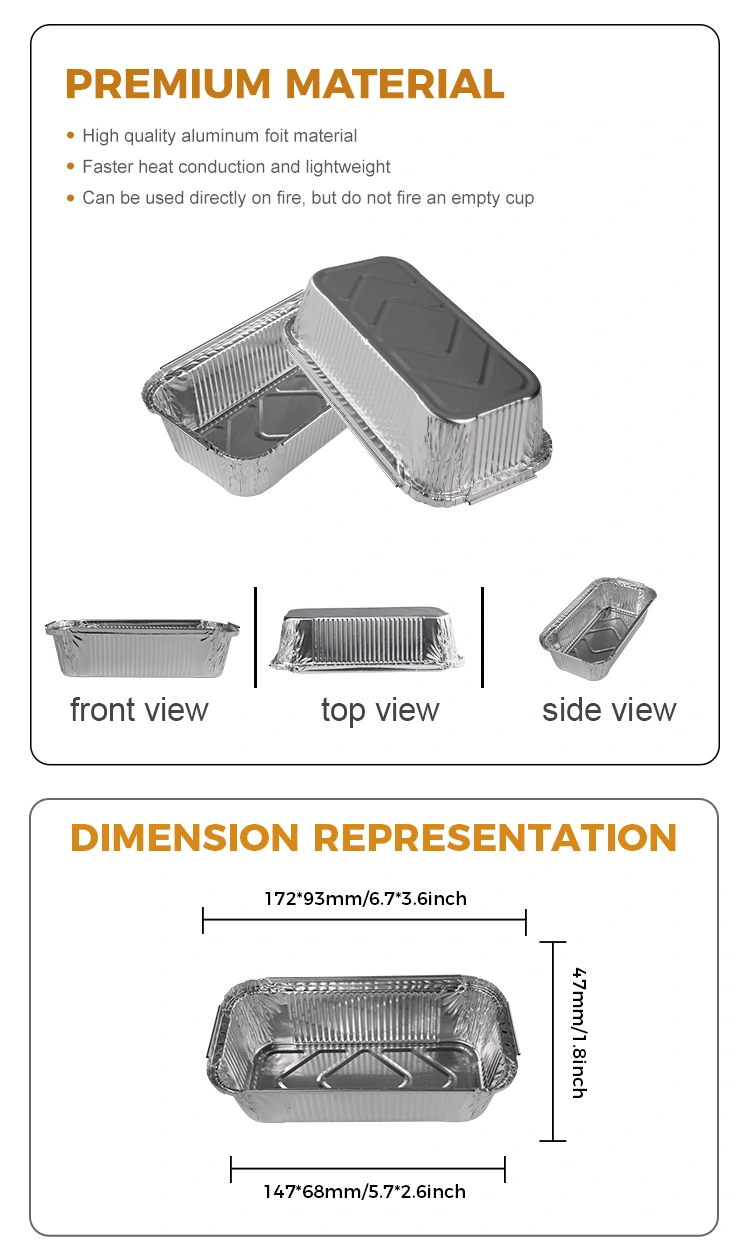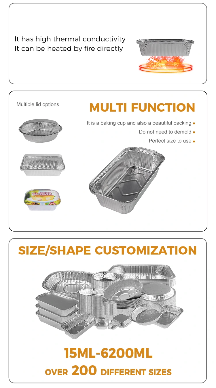Jednorázové obdélníkové pečivo stříbrné hliníkové fólie od dodavatele hliníkové fólie Yunchu je všestranným kuchyňským nástrojem vhodným pro různé způsoby vaření, jako je grilování, horký hrnec, gratin, balení s sebou a další. Tento kontejner je dostatečně kompaktní, aby se vešel do různých hrnců a vybavení, a přichází v různých velikostech, aby vyhovoval potřebám různých otevřených plamenových grilování. Lze jej použít k výrobě různých potravinářských výrobků, jako jsou vzduchové fritézy a další aplikace pro vybavení, odpor tepla a oleje, snadné pečení.