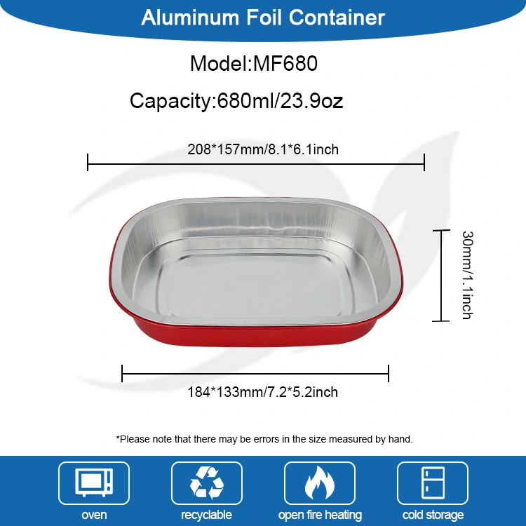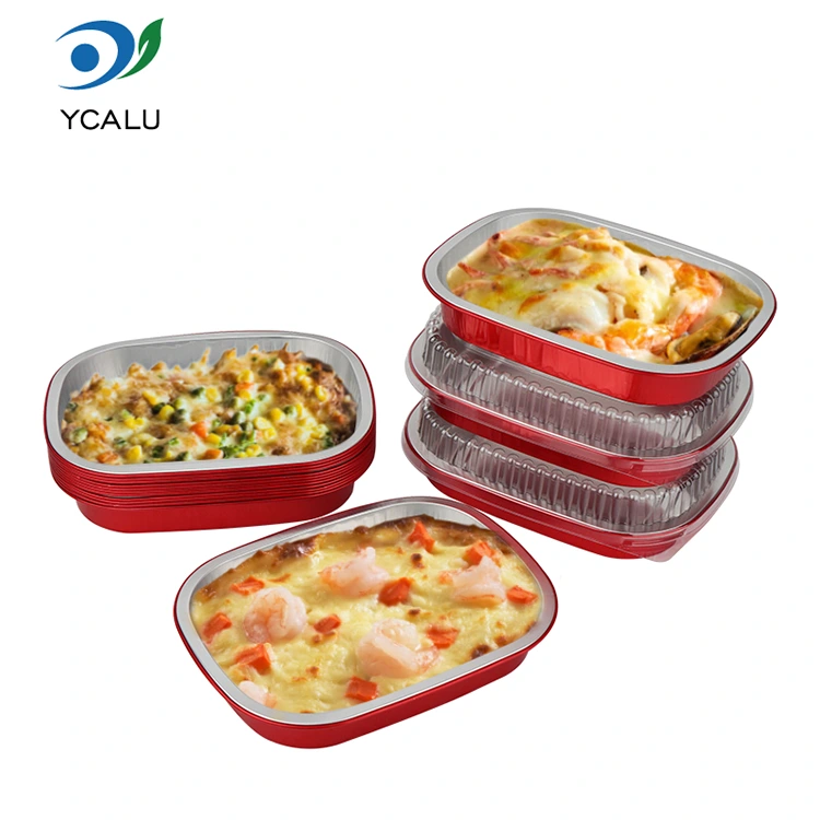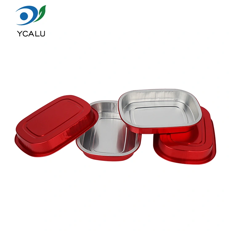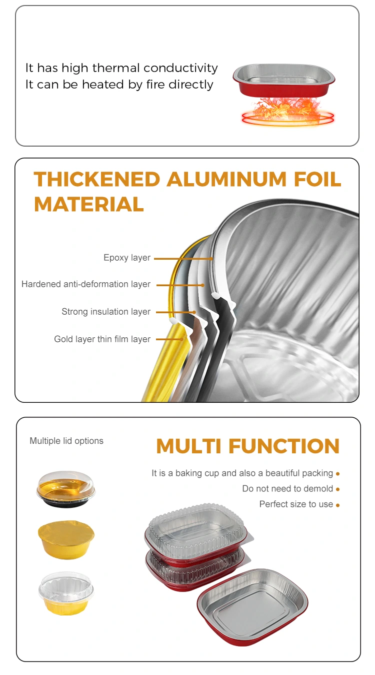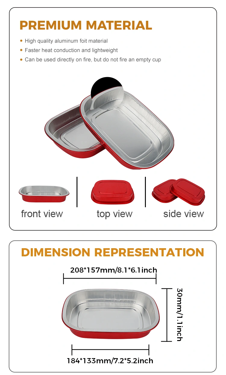 Yunchu je profesionální výrobce a dodavatel hliníkových fóliových kontejnerů v Číně. Jednorázové červené krabice na oběd čtvercové hliníkové fóliové kontejnery, které pro vás poskytujeme, mají průměr 208 x 157 milimetrů (8,1 x 6,1 palce). Spodní průměr je 184 x 133 (7,2 x 5,2 palce), výška je 30 (1,1 palce) a kapacita je přibližně 680 mililitrů (23,9 OZ). Přijímá základní materiál potravinářské potravinářské hliníkové fólie zesílený 8011, který bere v úvahu jak houževnatost, tak nosnost, nelze jej snadno deformovat nebo prosakovat a může přímo podporovat potraviny. Je kompatibilní s ultra širokým teplotním rozsahem -20 ℃ až 220 ℃. Není nutné žádné vyjímání z formy. Může být přímo vložen do trouby, fritézy nebo parního hrnce a může být také chlazen pro konzervaci. Nabízí pohodlnou zkušenost „pečení – skladování – spotřeba – likvidace“ na jednom místě. Hlavní výhodou hliníkové fólie je její vysoká tepelná vodivost. Zlatý povlak pomáhá shromažďovat teplo a zajišťuje, že se jídlo ohřeje rovnoměrně a rychle.