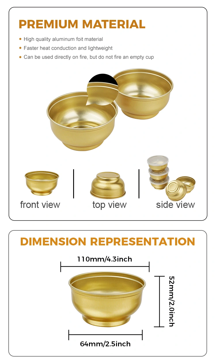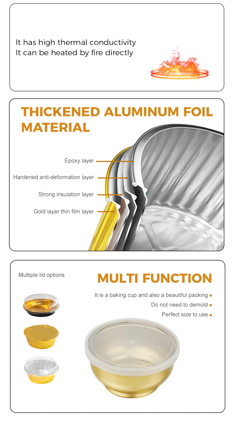 Dodavatel hliníkové fólie Yunchu, jednorázová kulatý kulatý malý zlatý miska z hliníkových fólií, zahuštěná hliníková fólie, vysoká tvrdost, snadno se deformovaná, může být utěsněna bez úniku, silná tepelná odolnost, opakovaně použitelná, opětovné, a má dobré tepelné izolaci - silné tepelně - je možné, že je to jako plíseň, a je možné, že je to jako plíseň, a je možné, že je to jako plíseň, a je to možné, a je třeba silně oživit a má jako plíseň, a je to pevně odolnost a je to Napařená, chlazená, zmrazená a je recyklovatelná. PE vnitřní membrána s potravinami, kovový materiál spárovaný s potravinovou pevnou membránou, bezbarvou a bez zápachu silného těla nádoby způsobuje, že malá nádoba není snadno deformovaná, poskytuje dobrou ochranu, silnou bezpečnost a spolehlivost, pevně se kombinuje s tělem láhve, silné těsnění udržuje čerstvost produktu, zcela nové materiály, které jsou bezpečné, environmentální a opálované. Disposable round small gold bowl Aluminum Foil Containers are widely used in various food industries such as food factories, candy factories, dried fruit factories, bakeries, specialty food stores, and dried fruit sorting stores, etc. They are used to hold food, candy, honey, dried plums, dried fruits, aged tangerine peel, solid, liquid, and solid essence.