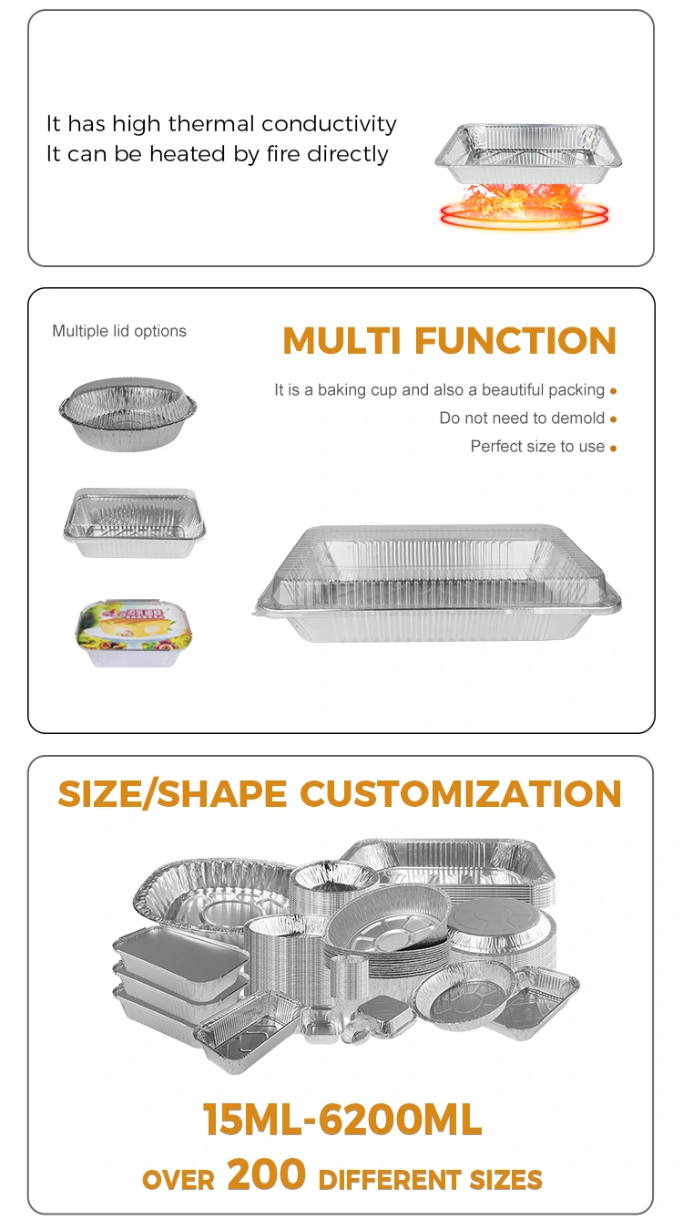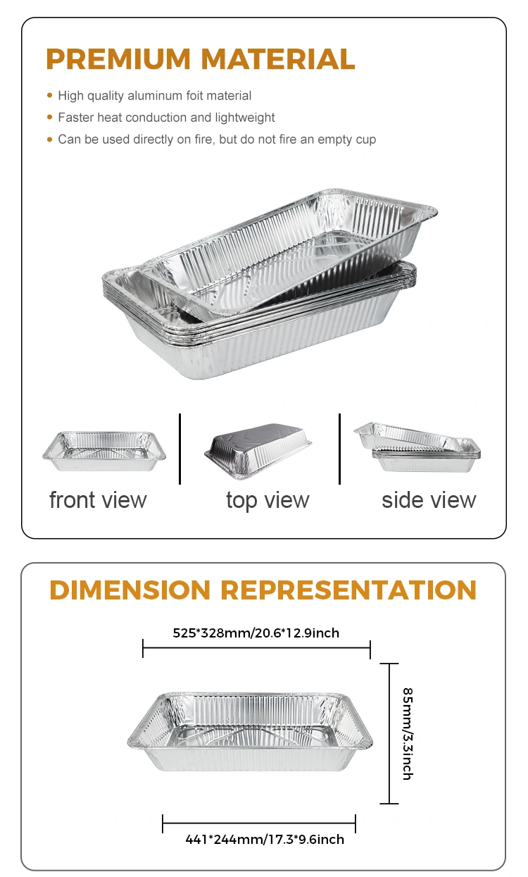 Vlastnosti: Tato velká kapacita venkovní pečení stříbrné fólii je vyrobeno z hliníkového materiálu z hliníku 8011-0, který plně splňuje kontaktní standard pro potravinářské úrovně a zajišťuje bezpečnost potravin bez zvláštního vůně a je jistější použít. Má konkávní a konvexní vnitřní design, který je bezpečnější k použití. Zařízení neobsahuje čištění a dobře chrání vložku vybavení. Ať už pečení nebo zahřívání na otevřeném plameni, není třeba se starat o deformaci kontejneru nebo ovlivňující bezpečnost potravin.