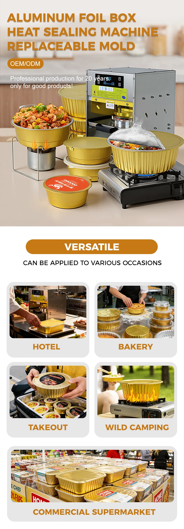 Yunchu má vlastní továrnu a je výrobcem a dodavatelem ručního tepelného těsnění se zlatými hliníkovými fóliovými kontejnery v Číně. Přijímá materiály potravinářské kvality a je bezpečný a bez starostí. Vyrobeno z potravinářské hliníkové fólie / PP materiálu, prošlo autoritativními bezpečnostními testy, je bez zápachu, odolné vůči vysokým a nízkým teplotám (-20 ℃ až 220 ℃) ​​a lze jej přímo ohřívat v mikrovlnné troubě, péct v troubě nebo zmrazovat pro skladování, čímž splňuje různé potřeby zpracování a konzervace potravin a poskytuje spotřebitelům silný pocit bezpečí.