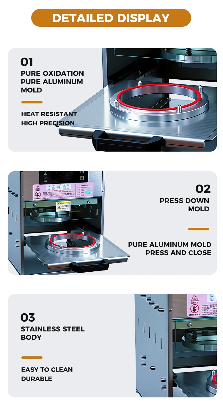 Silná přizpůsobivost a jednoduchá obsluha: Dokonale kompatibilní s tímto zlatým obědovým boxem a také kompatibilní s různými obaly z kompozitní fólie PP/PE. Není vyžadováno žádné odborné školení a můžete začít za pouhých 10 sekund. Stačí zavřít a zarovnat krabičku na oběd a jemně zatlačit tepelný uzávěr na 3 až 5 sekund, aby se těsnění dokončilo, čímž se výrazně zlepší účinnost balení.