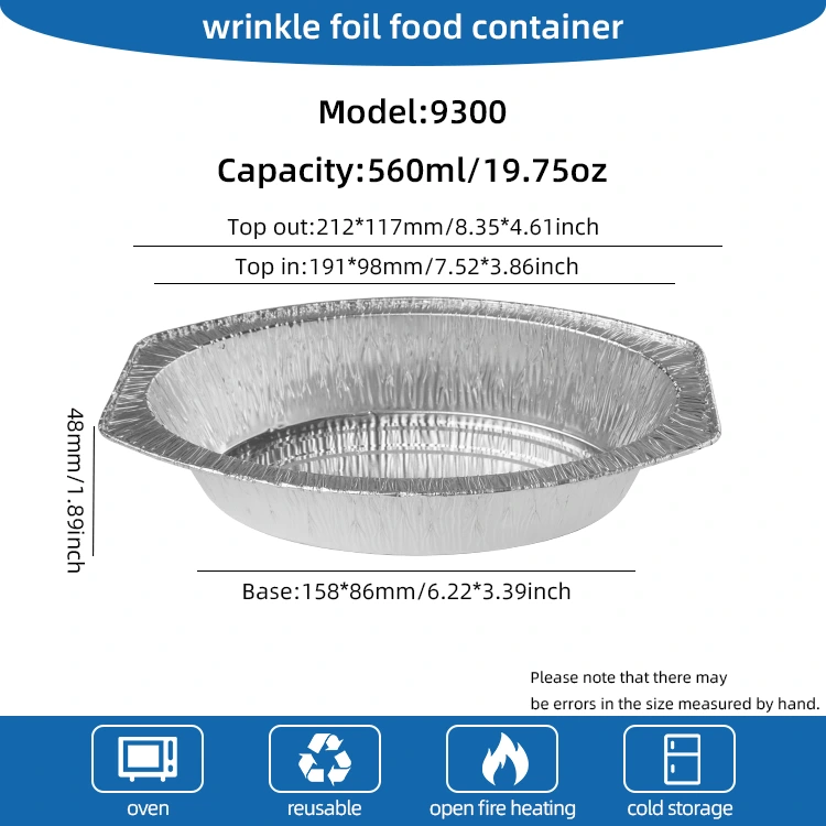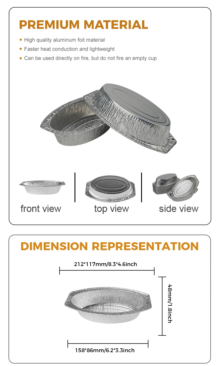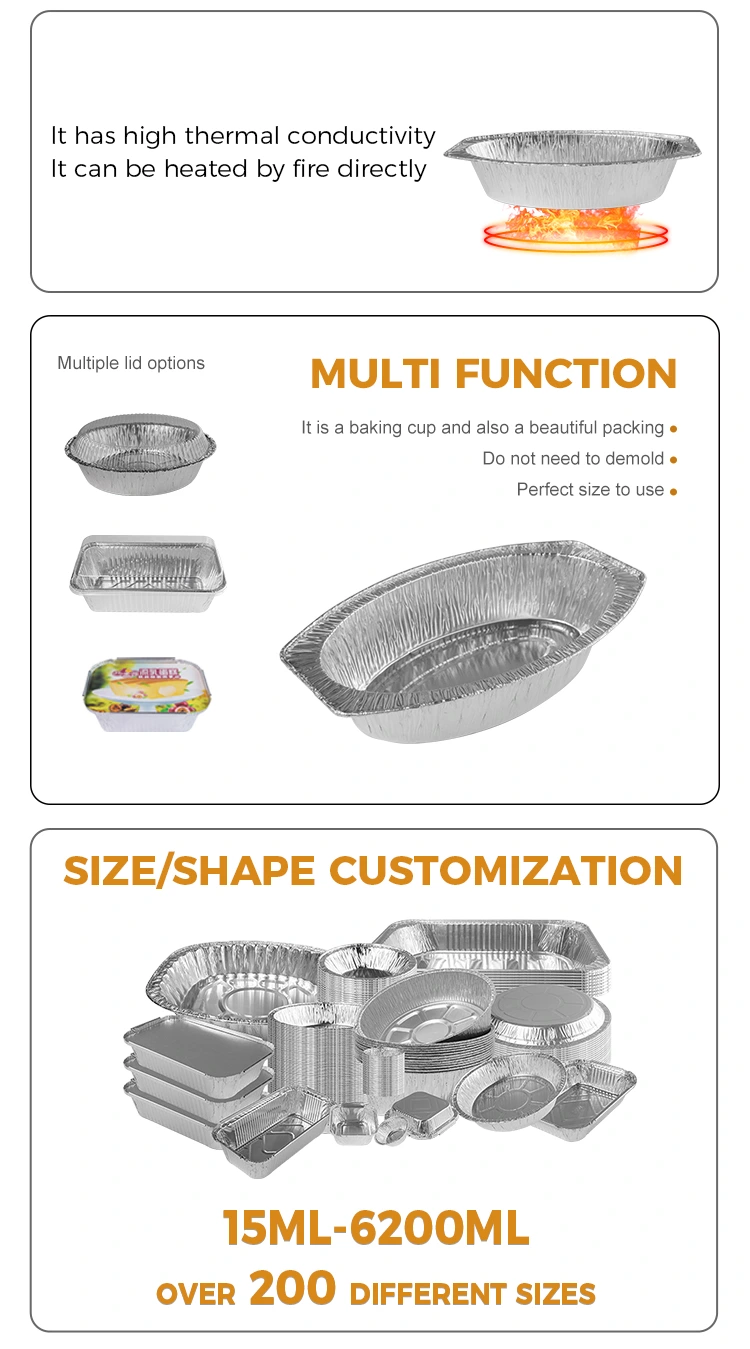 Dodavatel hliníkové fólie Yunchu nabízí oválný pečený chléb stříbrný hliníkový fóliový nádoby pro domácí vaření, pekárny, řetězové obchody a chlazené dodávky potravin. Tato nádoba, vytvořená z hliníkového materiálu z hliníku na obsahu potravinového obsahu, má jedinečný oválný tvar, díky kterému vyniká mezi mnoha stříbrnými pekáčskými krabicemi. Tento kontejner je obzvláště vhodný pro držení horkých kapesníků, ovoce, chleba a všech druhů retortových potravin a může vyhovět potřebám široké škály nádobí. Vzhledem k dobré tepelné vodivosti může rovnoměrně rozptýlit vysoké teploty a zajistit rovnoměrné zahřívání potravy. Kromě toho má určitou kapacitu a tlakovou odolnost proti zátěži, udržuje stabilitu i v případě více hromádek, prevence deformace a je ideální pro použití během přepravy. Abychom se lépe přizpůsobili různým scénářům a potřebám, lze tento kontejner také přizpůsobit podle požadavků zákazníka a poskytnout odpovídající víčka pro větší praktičnost.