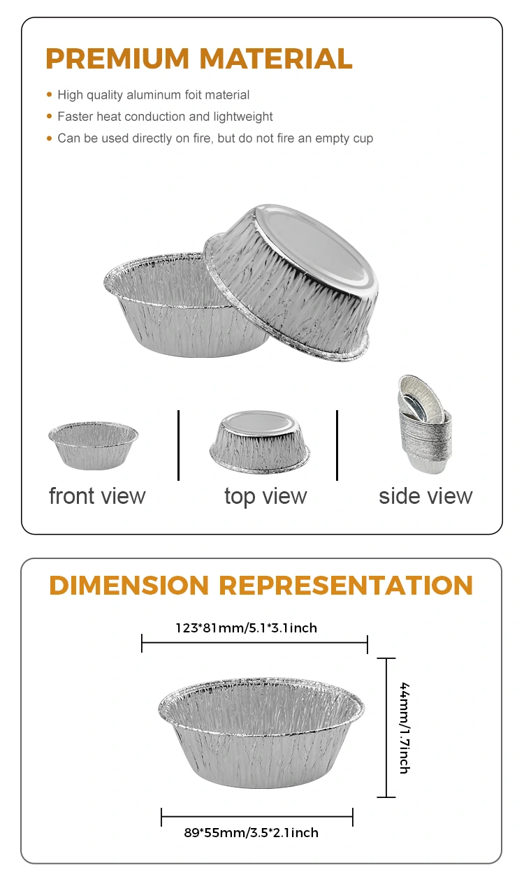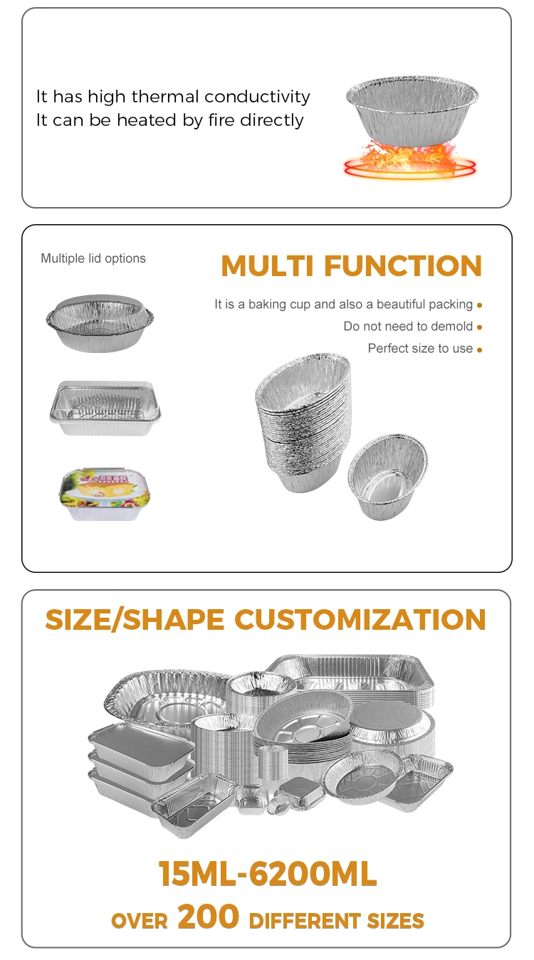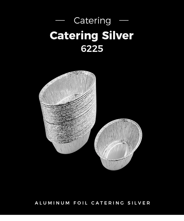 Yunchu Aluminum Foil Supplier Oval steamed cake Silver Aluminum Foil Food Container Model 6225 is an aluminum foil container that can be used for commercial and household use, which can unlock more uses, such as baked eggs, baked oysters, egg tarts, cakes, etc., and can also be used as sauces, dips, small condiments and baking tasting samples, using 8011 food-grade silver aluminum Materiál fólie, integrální formování, zeď je stejně hladká jako zrcadlo, které je krásné i praktické, design lemu neubližuje vašim rukama a řada specifikací a velikostí splňuje vaše různé potřeby.