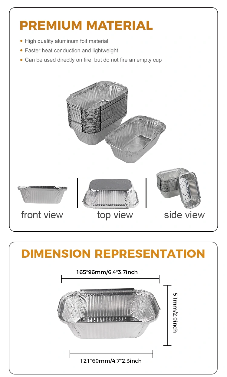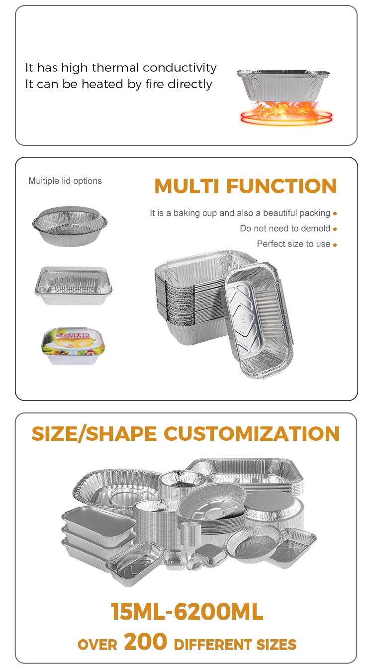 Funkce: Hliníková fóliová obědová krabička, kterou poskytujeme, je vyrobena z hliníkového materiálu 8011, který má vynikající výkon ochrany tepla a může efektivně udržovat teplotu potravy, což způsobuje atraktivnější jídlo. Zejména naše obdélníkové pečené rýžové stříbrné hliníkové fóliové nádoby mají nejen tepelné izolační vlastnosti, ale lze je také kombinovat s víčkami hliníkových fólií nebo víčkami pro domácí zvířata, aby se usnadnilo přizpůsobené přizpůsobení log, čímž se zvyšuje body paměti zákazníků a zvyšuje povědomí o značce.
