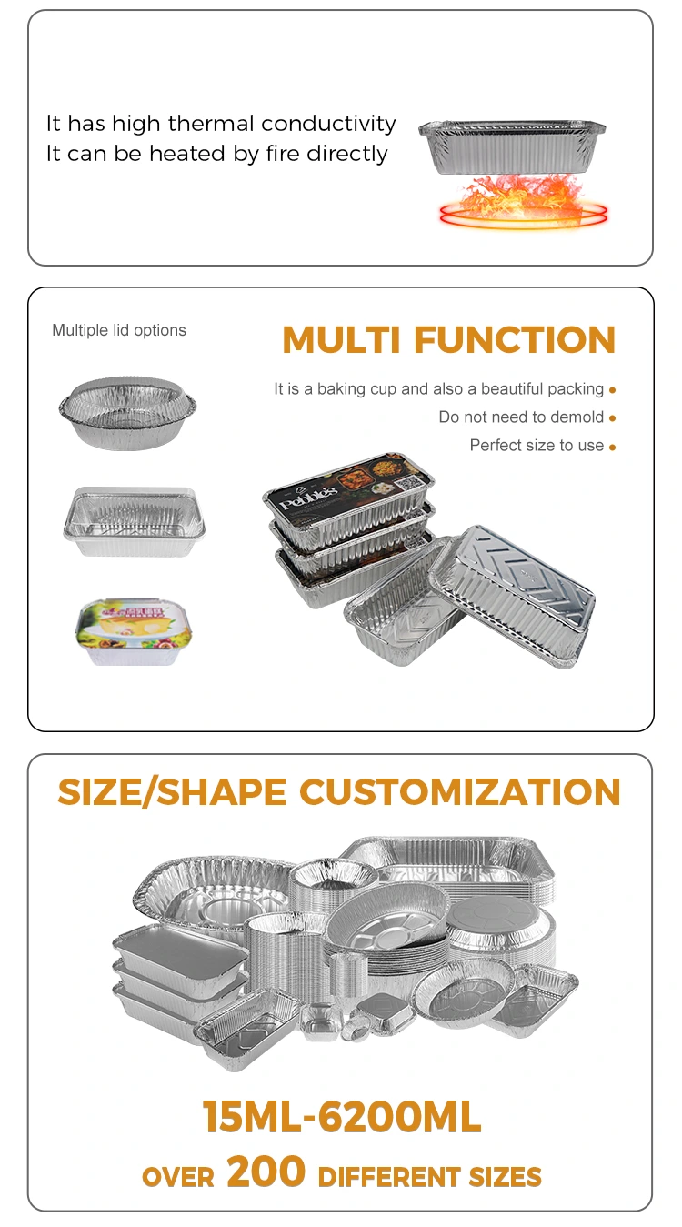 ​Yunchu aluminum foil supplier, Rectangular barbecue thickened Silver Aluminum Foil Containers, is a good helper for barbecue, hot pot, baking, takeaway packaging, a variety of cooking skills can be done in a box, various sizes are suitable for a variety of pots and equipment, etc., sizes and specifications, to meet a variety of open flame barbecues, etc., can choose to make any food, air fryer and other equipment Aplikace, odolnost proti teplu a oleji, snadné pečení, venkovní grilování, dočasné misky se nebojí oheň, když se používají, potřebují jídlo nebo polévku, nesušíte bez vody, pece pro domácnost jsou čisté a pohodlné k likvidaci pokrmů.