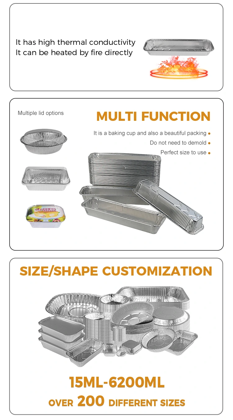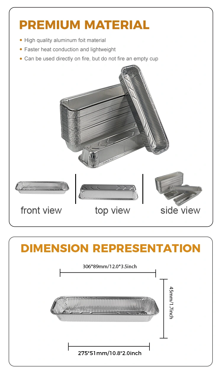Obdélníkový chlebový podnos na pečení stříbrné hliníkové fólie poskytované dodavatelem hliníkové fólie Yunchu je vyrobeno z materiálů na úrovni potravin a je vhodné pro různé aplikační scénáře. Tento produkt je zvláště vhodný pro účely grilování a pečení, jako je výroba dlouhých bochníků chleba nebo pečení. Ať už je to pro grilování uhlí nebo jako doručovací schránka s sebou, je to ideální pro použití.