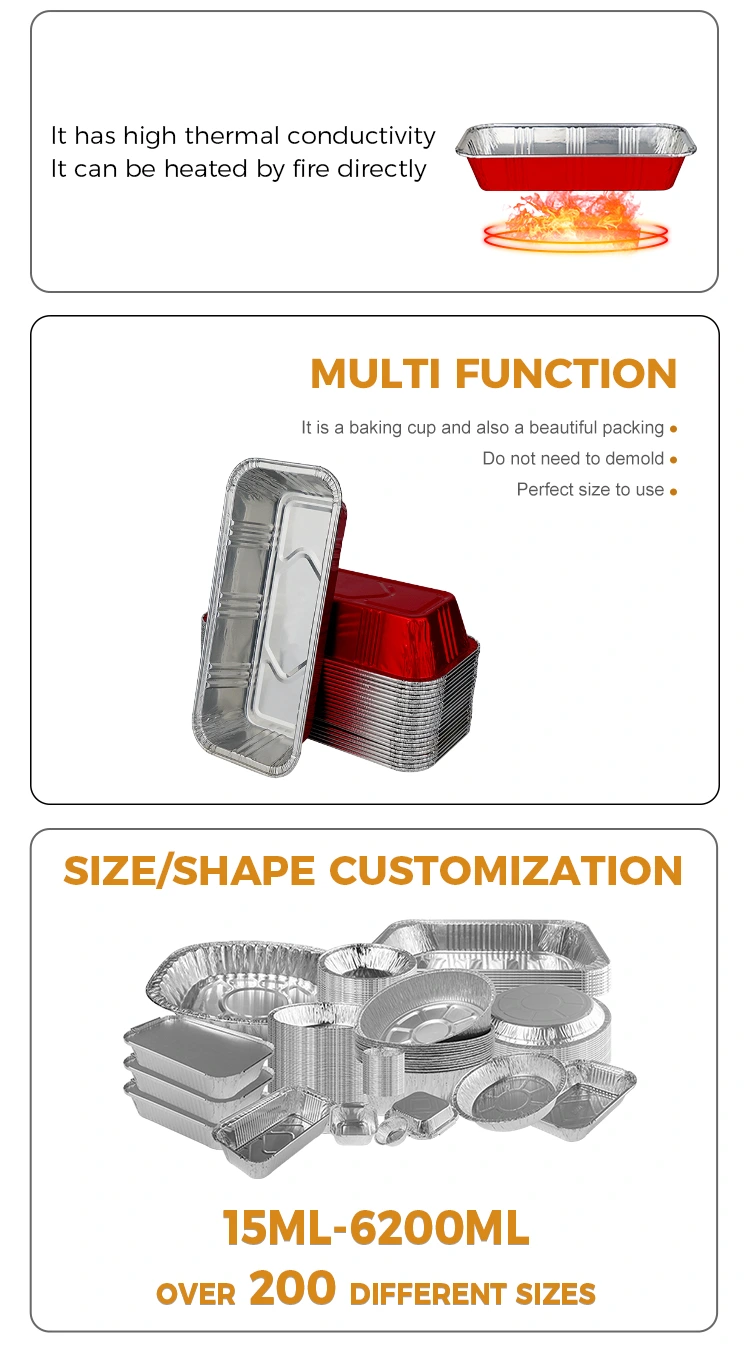 Yunchu Aluminium Foil vám poskytuje vysoce kvalitní obdélníkové červené cateringové stříbrné hliníkové fóliové kontejnery, které jsou navrženy tak, aby byly odolné a tepelně odolné, mohou rovnoměrně vést teplo, aby se zabránilo zuhelnatění, a mají silné těsnění, aby zůstaly čerstvé.