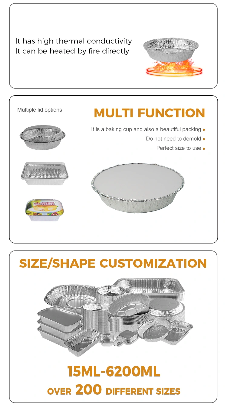 Vlastnosti: Jednodílné formování zahuštěné a pečené odolné vůči, adopci materiálu hliníkové fólie s přijetím potravinového kontaktu, ujistěte se, že kontaktujete potraviny, není snadné deformovat a netěsnost, silná tloušťka, odolnost proti korozi, vysoká teplota.
