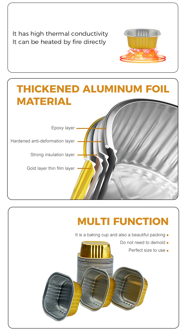 Čtvercové hrnky na pečení dezertů Smoothwall Aluminium Foil Container, navržené tak, aby byly krásné i funkční, byly navrženy tak, aby vydržely vysoké teploty bez vyblednutí. Je vyrobena z materiálu 8011-0 a má maximální žáruvzdornou teplotu až 660°C. Běžné kuchyňské vybavení může také dosáhnout 200 °C, což zajistí, že se jídlo nepřipálí ani nepopraská. Protože je vyroben ze zesíleného materiálu, lze jej použít vícekrát. Celá věc byla zpracována čtyřmi vrstvami technologie. Po uvaření ho můžete vyzvednout a sníst bez obav z deformace. Kromě toho je také velmi pohodlné čištění a můžete přímo kontaktovat přísady pro udržení hygieny.