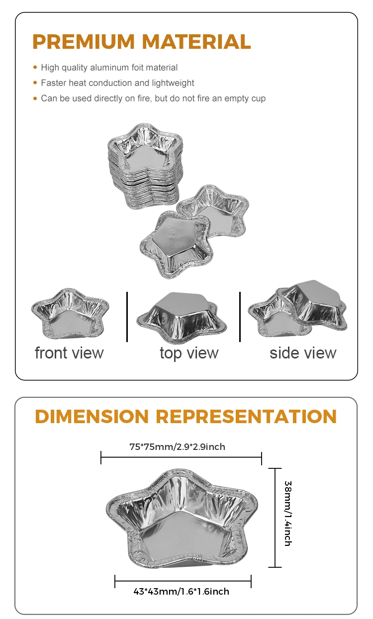 Dortové košíčky z hliníkové fólie ve tvaru hvězdy jsou vyrobeny ze stříbrné hliníkové fólie a jsou odolné vůči vysokým teplotám a zůstávají stabilní mezi -20 °C a 300 °C. Jsou vhodné pro pečení a použití ve fritéze a mohou zabránit poškození vnitřních stěn spotřebiče. Jsou jednorázové, takže jsou pohodlné, protože není potřeba žádné čištění.