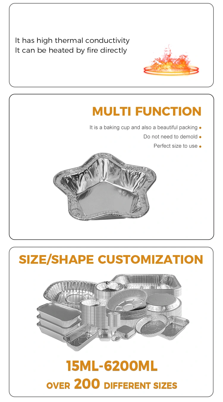 Dodavatel hliníkové fólie Yunchu Hvězdicové tartové košíčky z hliníkové fólie na pečení Hliníková fóliová nádoba na jídlo, forma na dort ze zesílené hliníkové fólie se stabilním tvarem, vyrobená z potravinářské hliníkové fólie, usnadňuje vyjmutí z formy po upečení. Tyto dortové košíčky z hliníkové fólie ve tvaru hvězdy na pečení hliníkové fólie jsou odolné vůči vysokým teplotám, nelze je snadno spálit nebo přilepit, s navrženým a zpracovaným dnem a okraji pro rovnoměrné vedení tepla, zesíleným a zesíleným integrovaným tvarováním, běžně používaným pro smažení na vzduchu, vaření v páře, pečení atd.